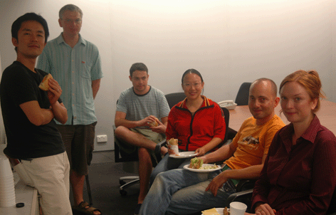 Students taking a break during the April symposium, (from left) Shigeki Amitani, Alastair Weakley, Julien Phalip, Yun Zhang, Zafer Bilda, Deborah Turnbull.